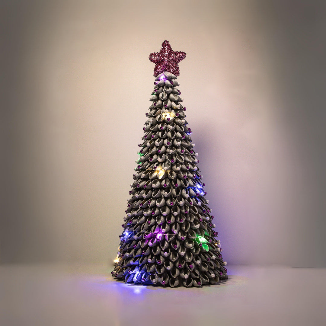 This beautiful silver Christmas tree is adorned with purple ornaments and lit up with multicolored lights. With a bright purple star atop, this festive decoration will bring joy to your holiday celebrations.